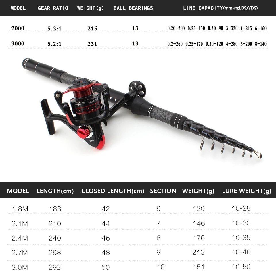 1.8m 2.1m 2.4m 2.7m 3.0m Carbon Fiber Telescopic Fishing Rod Portable Spinning Rod and Spinning Reels Multifunction set
